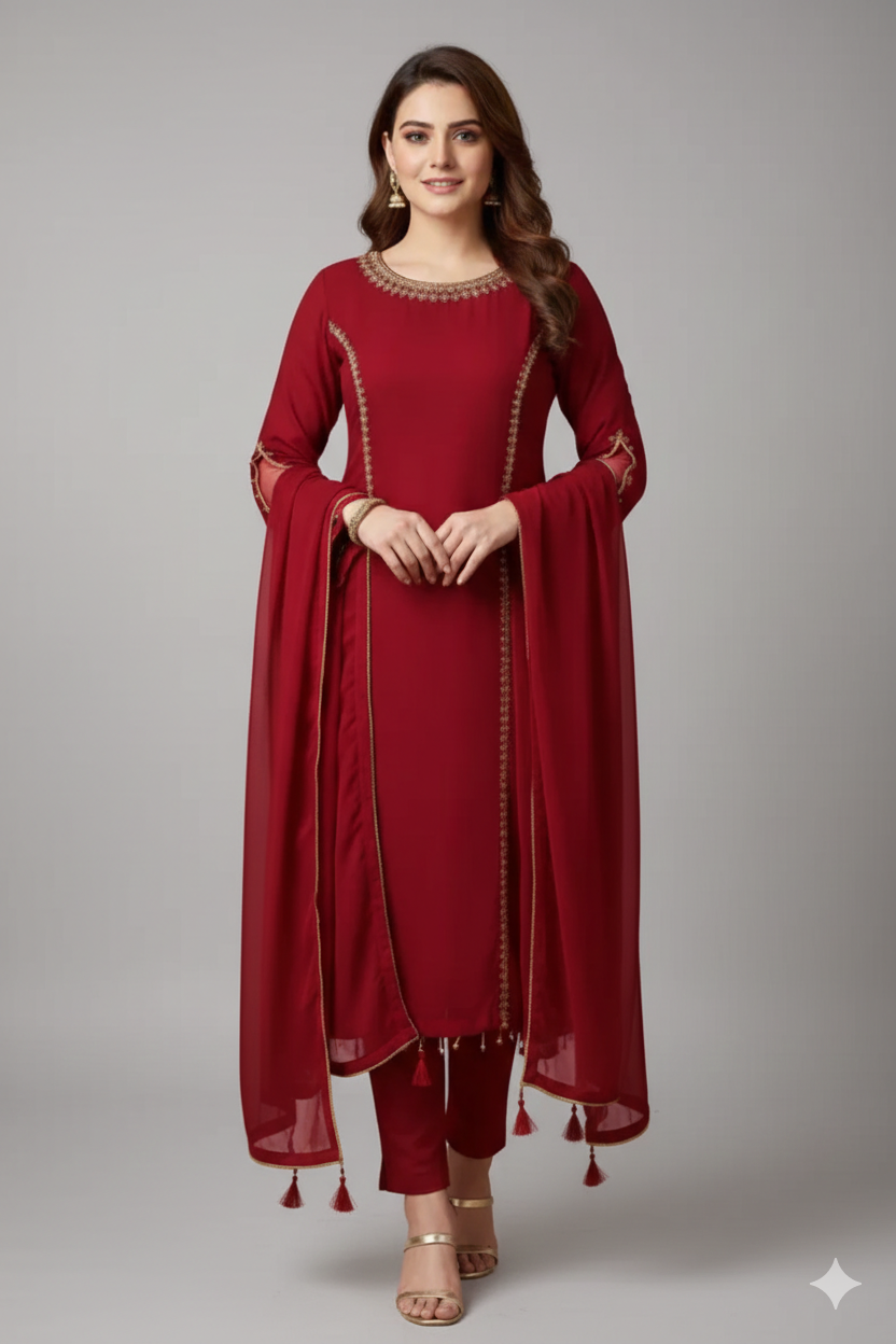 Add a touch of grace to your wardrobe with this Crimson Glow Chiffon 3-Piece Suit. Designed for sophistication and comfort, this outfit features hand adda work detailing on a flowy chiffon shirt, paired with a soft chiffon dupatta and a smooth Raw Silk trouser. Its vibrant crimson shade brings timeless elegance to festive gatherings or formal occasions.