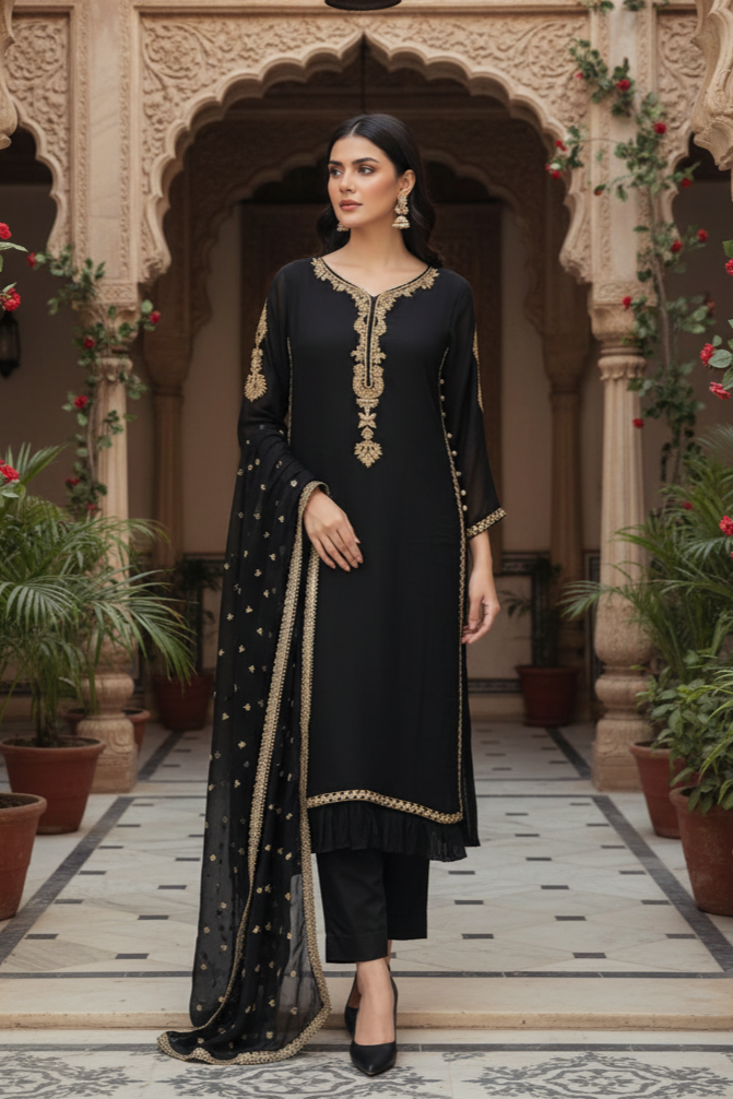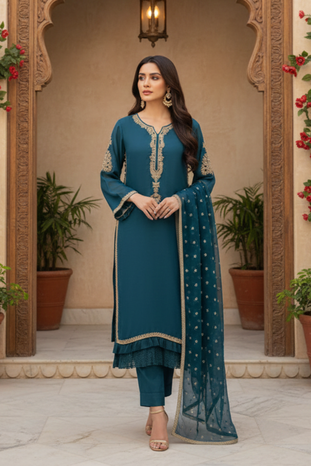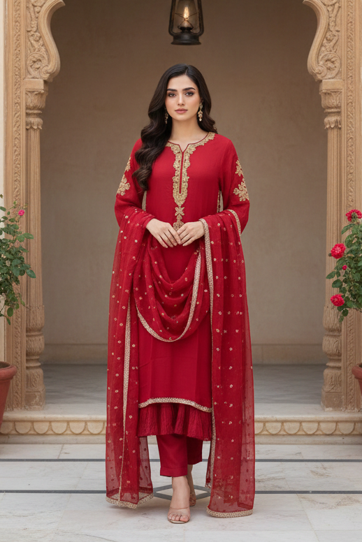 Elevate your wardrobe with this sophisticated three-piece ensemble. The chiffon shirt features intricate multiheaded embroidery on the front and sleeves, complemented by delicate hand embellishments along the neckline and finished with refined lace detailing. Paired with narrow-leg raw silk trousers featuring an elasticised waistband for comfort and ease. Complete the look with a beautifully dyed chiffon dupatta adorned with multihead chatta work. The crushed viscose inner ensures breathability and comfort throughout the day. Perfect for formal occasions and celebrations.